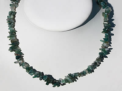 Les éclats de pierres d'Agate Mousse ont été minutieusement polis puis assemblés pour former un très original collier qui met en évidence toute la beauté de la pierre sous des éclats différents.
