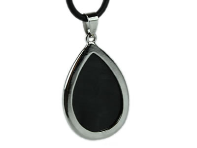 Très beau pendentif en pierre naturelle d'Obsidienne Oeil Céleste polie forme goutte et cerclé de métal de couleur argent.